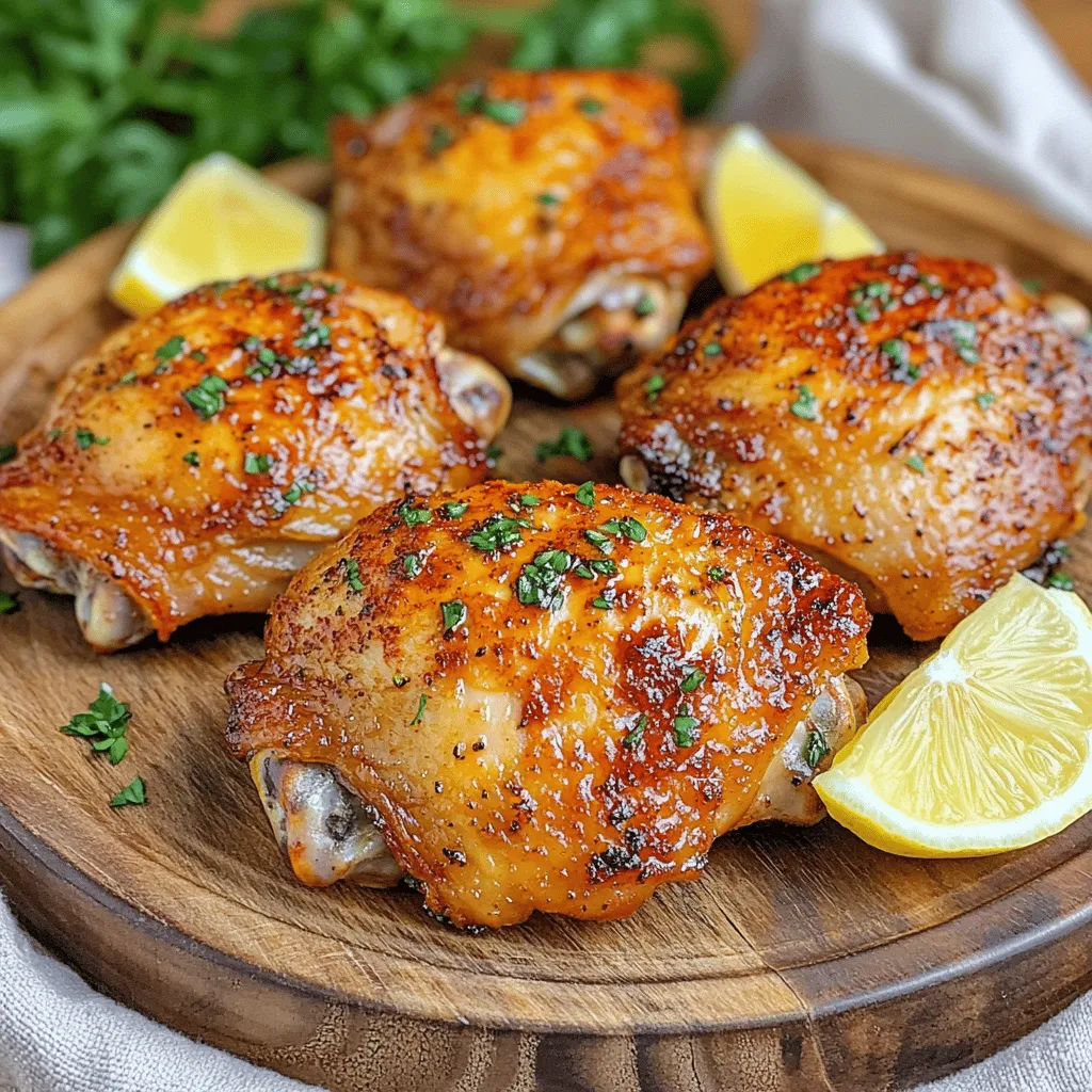 Kochen Sie die Hähnchenschenkel für 25-30 Minuten und wenden Sie sie zur Halbzeit, bis die Innentemperatur 74°C (165°F) erreicht und die Haut knusprig und goldbraun ist.