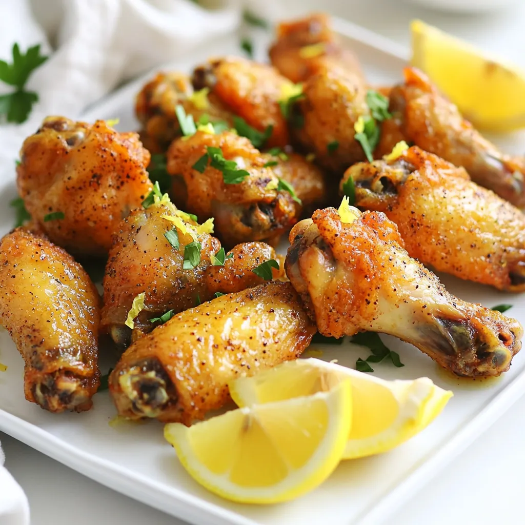 Nach dem Garen legen Sie die Flügel auf eine Servierplatte. Garnieren Sie sie mit gehackter frischer Petersilie und Zitronenschnitzen. Dies sorgt für einen spritzigen Geschmack und sieht toll aus.