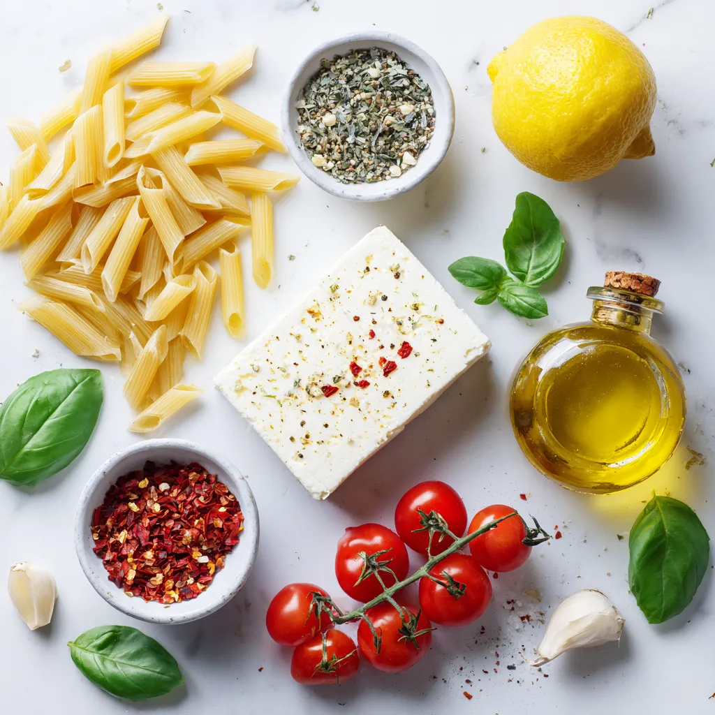Hauptzutaten für gebackene Feta-Pasta