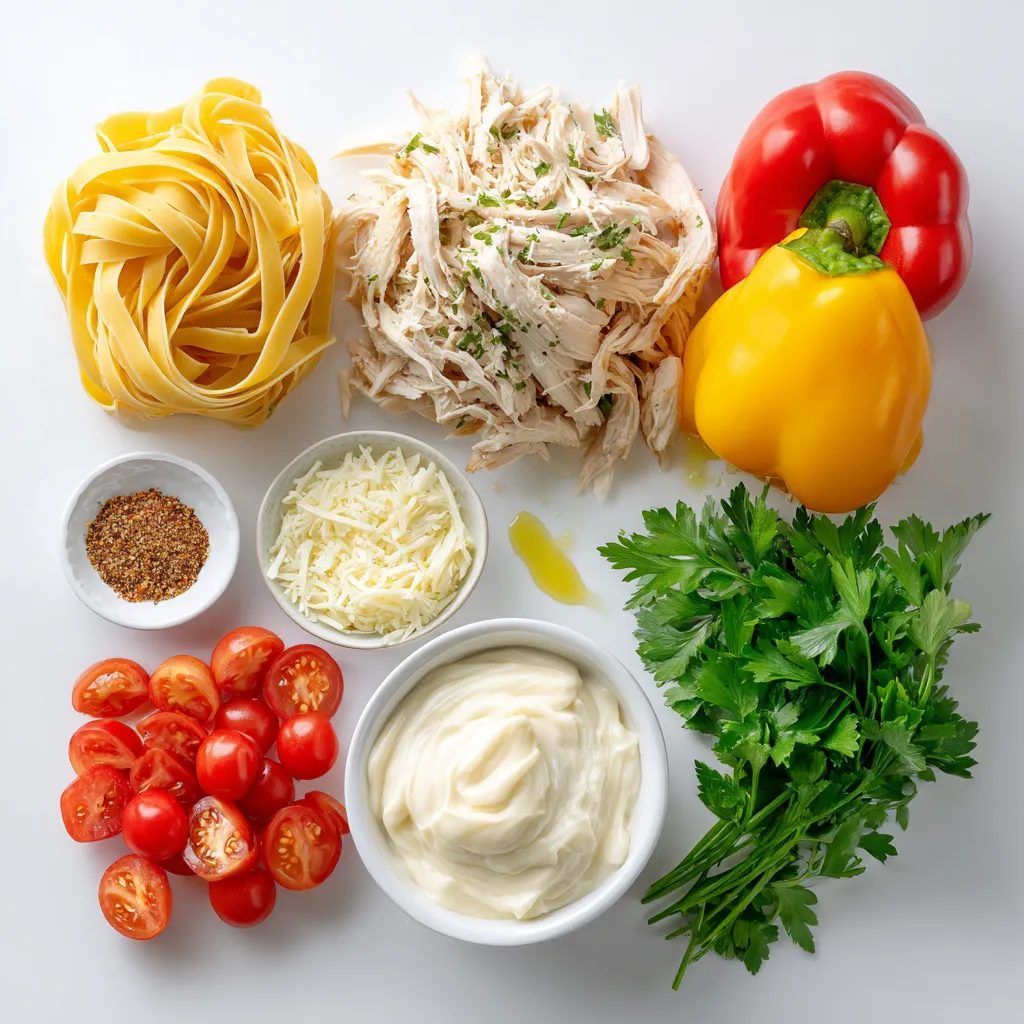 Heize deinen Ofen auf 190 °C (375 °F) vor. Dies ist wichtig, um die Paprika gleichmäßig zu garen. Bereite währenddessen alle Zutaten vor. Zerkleinere das Hähnchen und koche die Fettuccine-Nudeln. Halte alles bereit, um schnell arbeiten zu können.