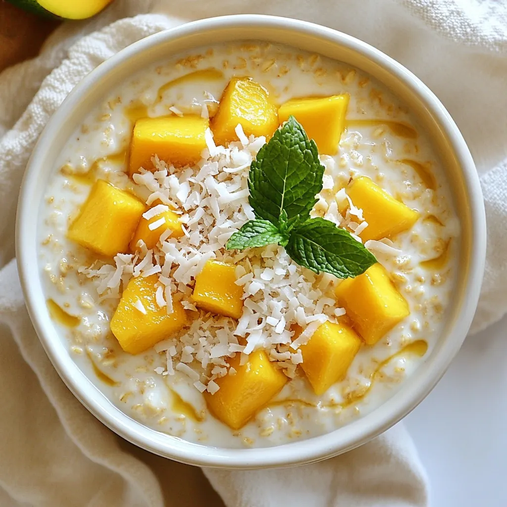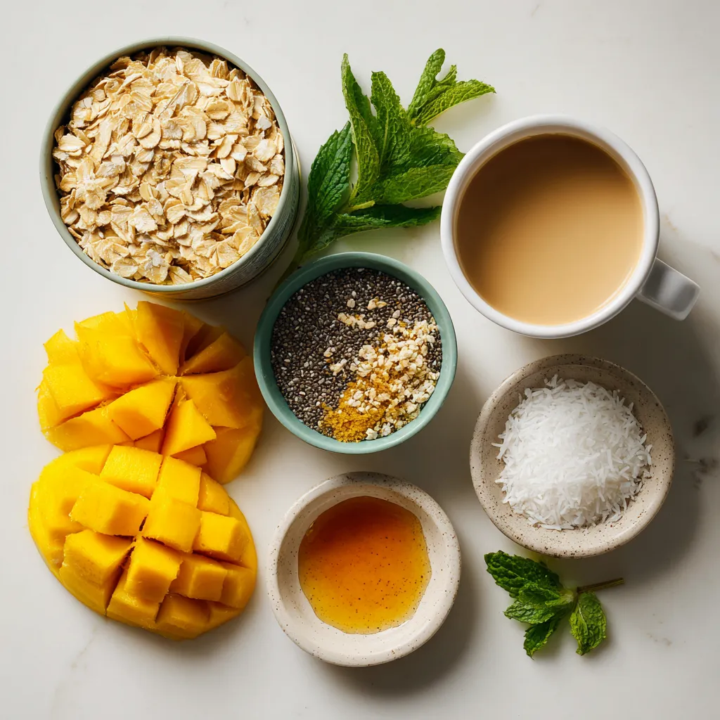 Diese Zutaten machen dein Frühstück frisch und lecker. Haferflocken sind die Basis und sorgen für die nötige Fülle. Kokosmilch bringt einen tollen Geschmack und eine cremige Textur. Die Mango gibt ein süßes und fruchtiges Aroma. Chiasamen fügen eine gesunde Note hinzu, während das Salz den Geschmack hebt. Wenn du es süßer magst, ist Ahornsirup eine gute Wahl. Die Minzblätter machen dein Gericht schön und frisch.