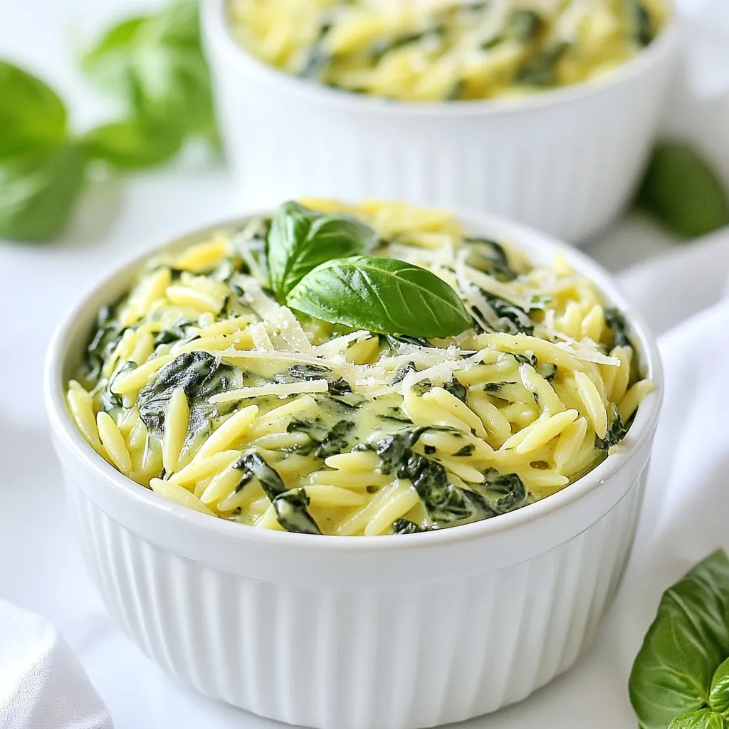 Ein cremiges und köstliches Gericht mit Orzo-Pasta, frischem Spinat und Parmesan.