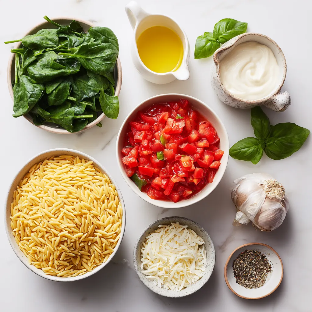 Die Hauptzutaten sind einfach zu finden. Orzo-Nudeln sind kleine, reisförmige Nudeln. Sie nehmen die Aromen gut auf. Gemüsebrühe bringt Tiefe in das Gericht. Gehackte Tomaten sorgen für einen frischen Geschmack. Frischer Spinat bringt Farbe und Nährstoffe. Die Schlagsahne macht das Gericht cremig. Du kannst auch Kokoscreme nutzen, wenn du vegan kochen willst.