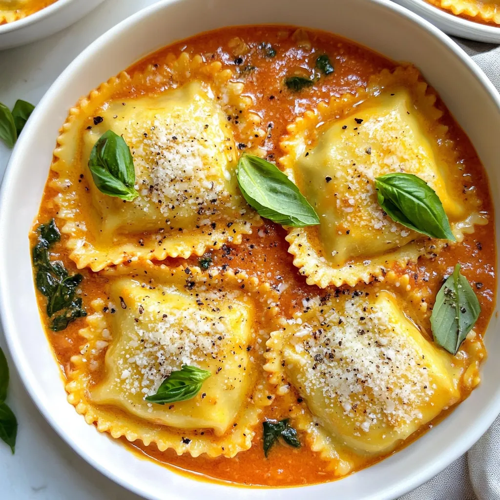 - Servieren Sie die Ravioli in Schalen, garniert mit frischen Basilikumblättern und nach Belieben mit zusätzlichem Parmesan bestreut.