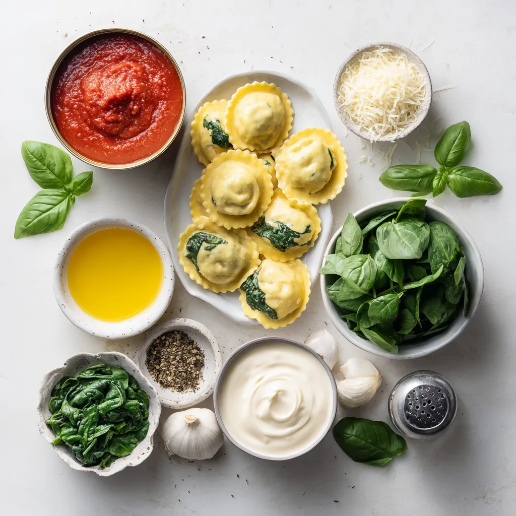 Liste der Zutaten für cremige Tomaten-Spinat-Ravioli