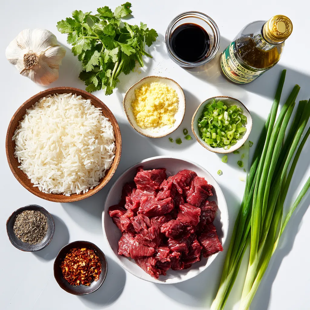 Zuerst musst du alle Zutaten bereitstellen. Du brauchst 450 g Rinderfilet, 400 g gekochten Jasminreis, 1 Esslöffel Pflanzenöl, 4 Frühlingszwiebeln, 2 Esslöffel frischen Ingwer, 3 Knoblauchzehen, 2 Esslöffel Sojasauce, 1 Esslöffel Sesamöl, 1 Teelöffel rote Pfefferflocken, Salz und Pfeffer. Frischer Koriander ist für die Garnierung wichtig. Achte darauf, das Rindfleisch dünn zu schneiden, damit es schnell gar wird.
