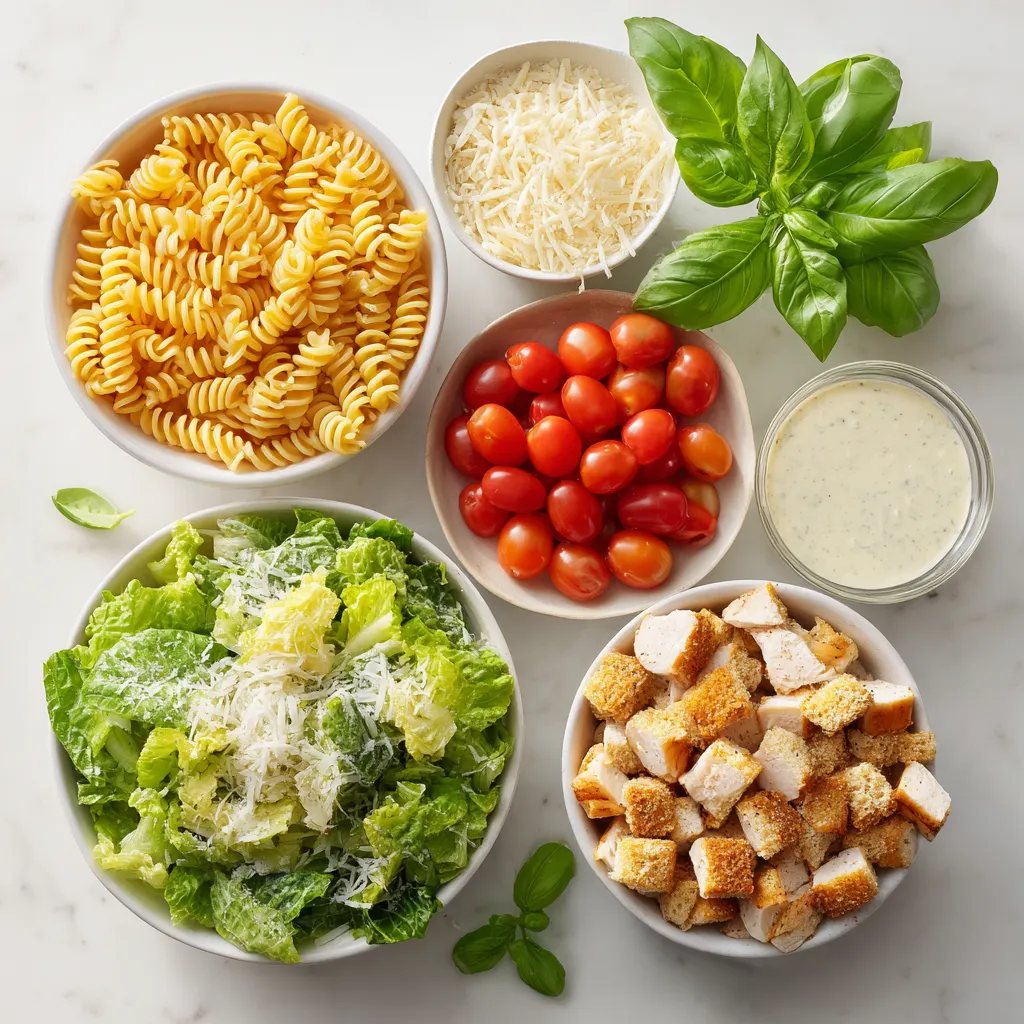 Für einen leckeren Hähnchen Caesar Pasta Salat benötigst du folgende Hauptzutaten: