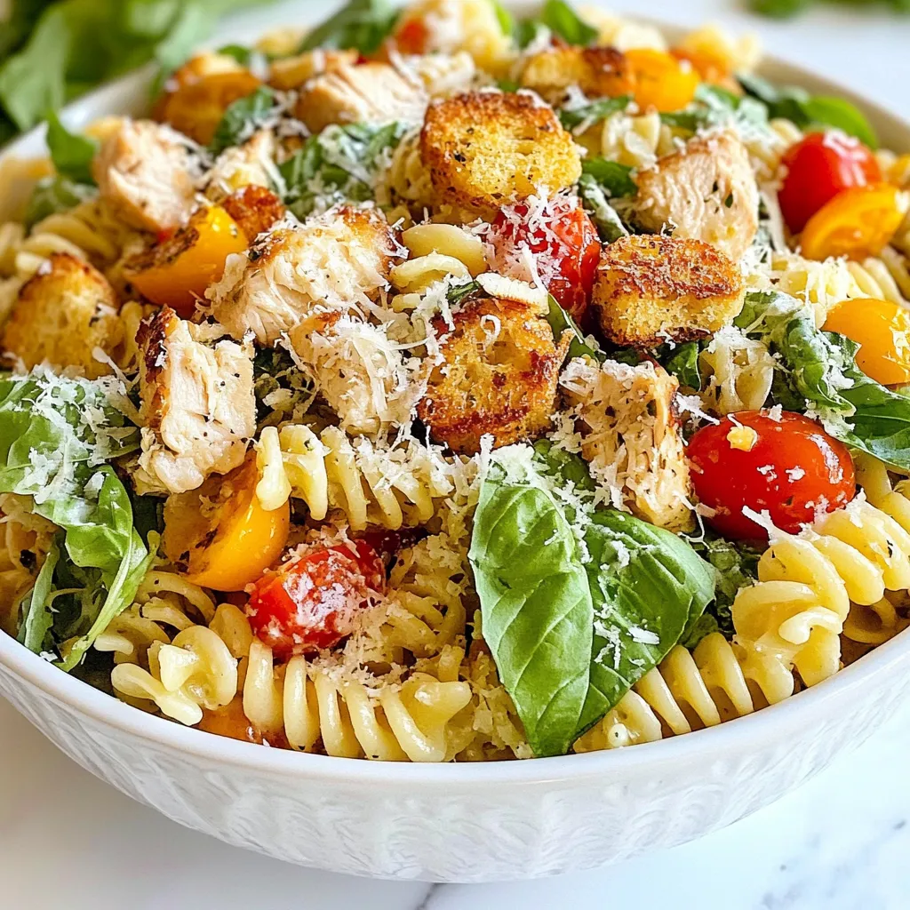 Jetzt ist der Salat fast fertig. Wenn du möchtest, streue die Croutons darüber. Sie geben dem Salat einen schönen Crunch. Mische sie sanft unter die Zutaten. Gib den Salat in eine Servierschüssel oder auf Teller. Garniere ihn mit frischen Basilikumblättern. Diese verleihen dem Gericht eine frische Note. Dein Hähnchen Caesar Pasta Salat sieht nun toll aus und schmeckt köstlich!