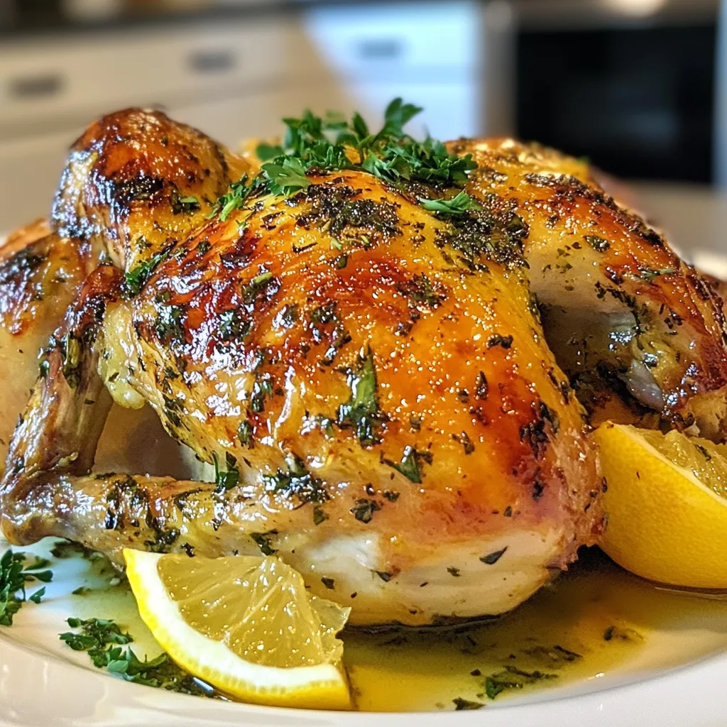 - Servieren: Das Huhn aufschneiden und mit frischer Petersilie garnieren. Sie können etwas von den Bratensäften über das Huhn träufeln, um den Geschmack zu intensivieren.