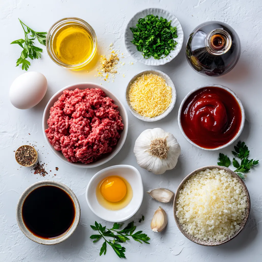 - In einer großen Rührschüssel das gemahlene Rindfleisch, die Semmelbrösel, den Parmesan, den gehackten Knoblauch, das Ei, die Sojasauce, die Worcestershire-Sauce sowie Salz und Pfeffer gut vermengen, bis alles gleichmäßig verteilt ist.