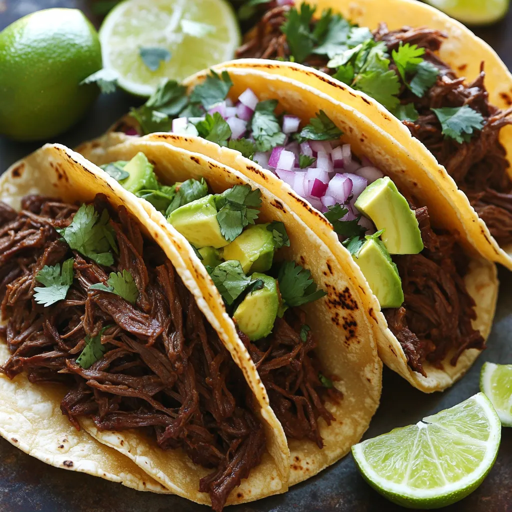 Jetzt kannst du die Tacos zubereiten. Wärm die Mais-Tortillas auf und fülle sie mit dem zarten Rindfleisch. Garniere sie nach Belieben mit frischem Koriander, gewürfelter roter Zwiebel und Avocado.