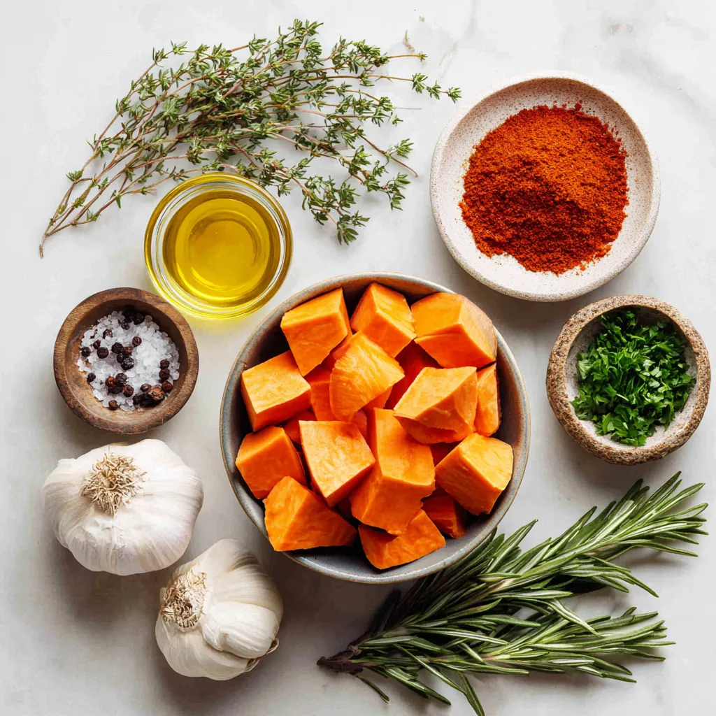 - In einer großen Schüssel die gewürfelten Süßkartoffeln, den gehackten Knoblauch, das Olivenöl, den Thymian, den Rosmarin, das geräucherte Paprikapulver, Salz und Pfeffer vermengen.
