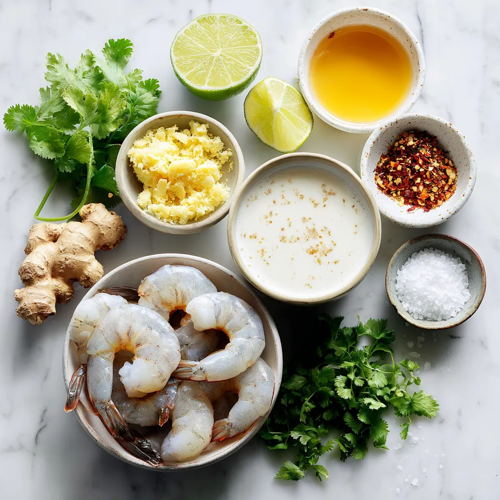 Diese Zutaten bilden die Basis für das Gericht. Die Garnelen sind der Star und bringen viel Geschmack. Die Kokosmilch sorgt für eine cremige Textur, während die Limette Frische hinzufügt.
