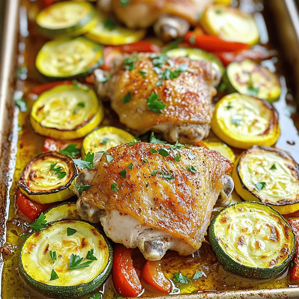 Nimm eine große Schüssel. Gib die geschnittenen Zucchini, die gewürfelten Paprika und den gehackten Knoblauch hinein. Füge das restliche Olivenöl und die restliche Gewürzmischung hinzu. Mische alles gut. Das Gemüse sollte gleichmäßig mit der Marinade bedeckt sein. Verteile das gewürzte Gemüse gleichmäßig auf dem Backblech. Lege die marinierten Hähnchenschenkel darauf.