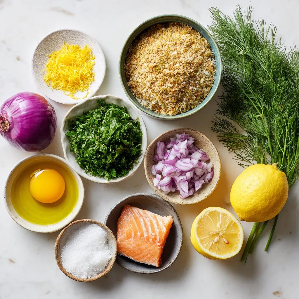Zuerst sammeln Sie alle Zutaten. Das macht den Kochprozess einfach. Nehmen Sie eine große Schüssel. Geben Sie den zerkleinerten Lachs, das Paniermehl, die rote Zwiebel, die Petersilie, den Dill und die Zitronenschale hinein. Diese Mischung sorgt für einen tollen Geschmack. Messen Sie den Zitronensaft ab und fügen Sie ihn hinzu. Bereiten Sie auch das Ei vor, indem Sie es in einer kleinen Schüssel verquirlen.