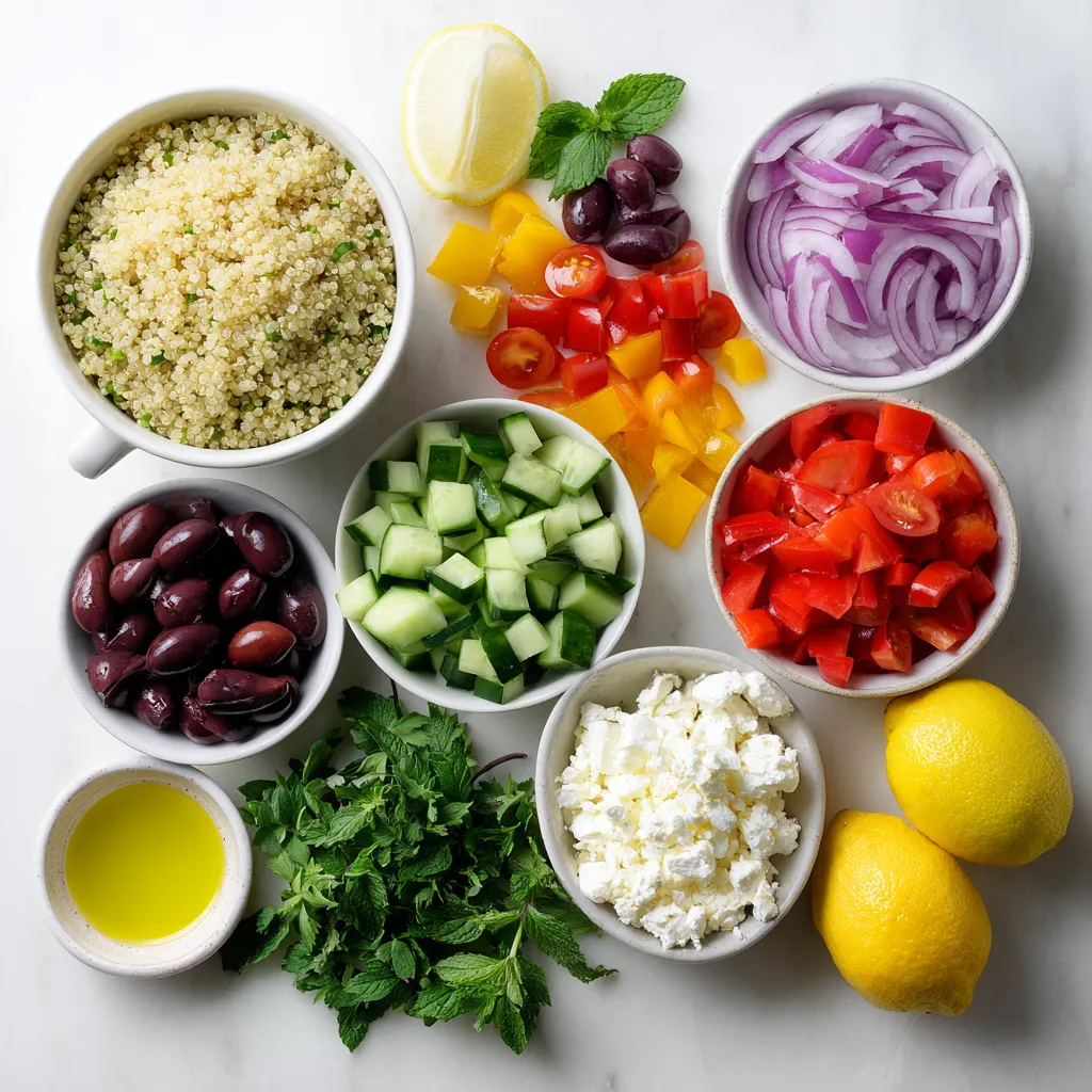 Quinoa ist der Hauptbestandteil und gibt dem Salat eine tolle Textur. Es ist gesund, voll von Proteinen und leicht zuzubereiten. Die Gurke sorgt für Frische und Knackigkeit. Kirschtomaten bringen Süße und Farbe. Paprika fügt etwas Süße und einen Biss hinzu, während die rote Zwiebel einen scharfen Kontrast bietet. Kalamata-Oliven geben einen salzigen, herzhaften Geschmack und der Feta-Käse bringt eine cremige Komponente in den Salat.
