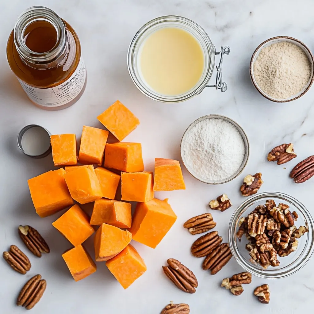 Die Hauptzutaten bilden die Basis für unseren Auflauf. Süßkartoffeln bringen eine natürliche Süße und eine schöne Farbe. Ahornsirup gibt zusätzliche Süße und einen tollen Geschmack. Mandelmilch macht die Mischung cremig und leicht.