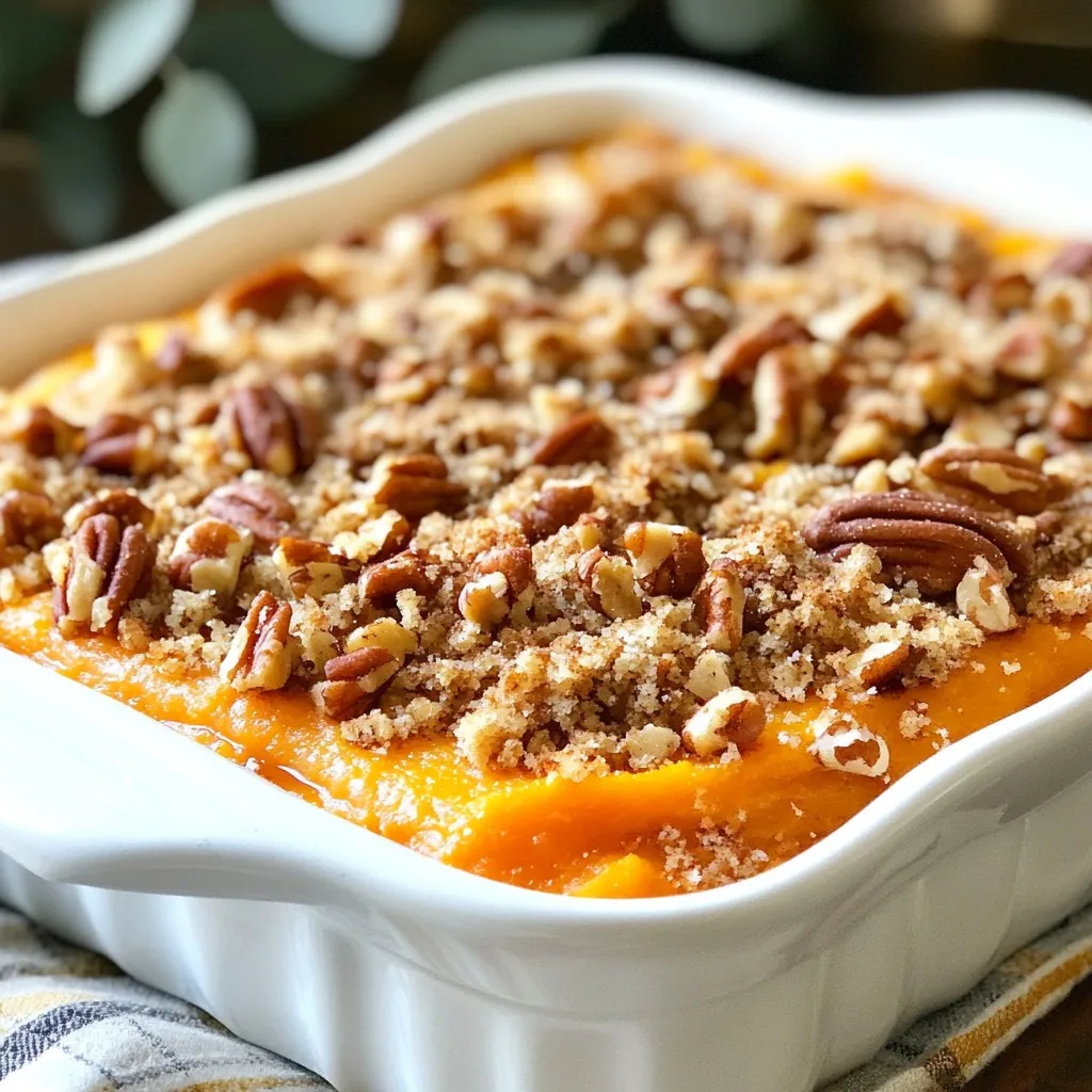 - Streue die Pekannussmischung gleichmäßig über die Süßkartoffelmasse.