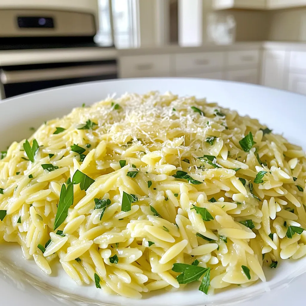 Die Hauptzutaten sind einfach und frisch. Orzo ist eine kleine Pasta, die leicht zu kochen ist. Die ungesalzene Butter gibt ein tolles Aroma. Knoblauch bringt viel Geschmack. Zitronensaft und -schale geben Frische. Petersilie und Basilikum sorgen für grüne Farbe und Geschmack. Parmesan ist ein leckerer Zusatz, aber nicht nötig.