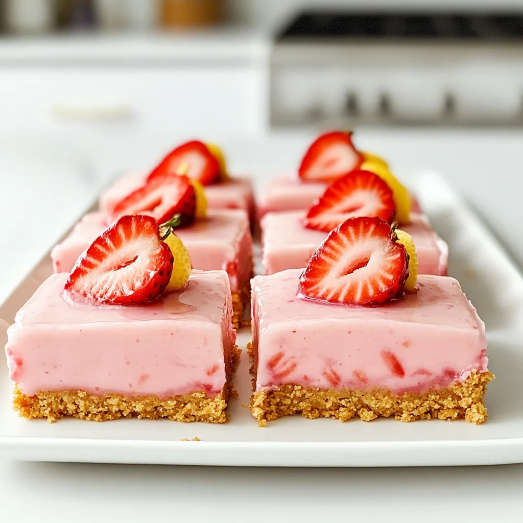 Für die Garnierung verwende frische Erdbeeren. Eine Scheibe oben auf jedem Riegel sieht toll aus. Du kannst auch Zitronenschalenstreifen verwenden. Diese verleihen einen schönen Farbkontrast. Serviere die Riegel auf einem hübschen Teller. So wird das Dessert ein echter Blickfang. Wenn du möchtest, serviere dazu etwas Sahne. So wird das Ganze noch cremiger und leckerer.