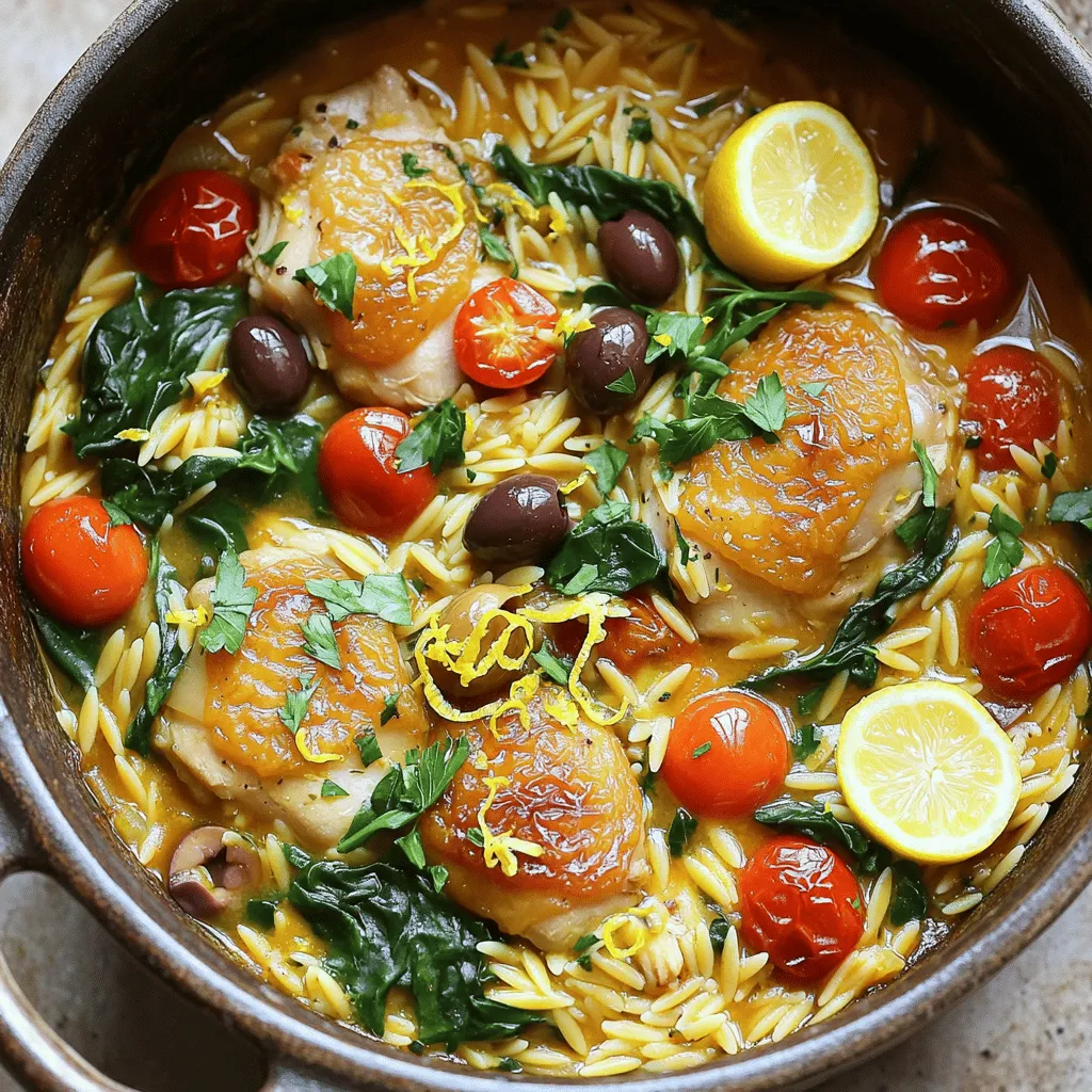 - 450 g Hähnchenschenkel ohne Knochen - 150 g Orzo-Pasta - 1 mittelgroße Zwiebel - 3 Knoblauchzehen Ich nutze Hähnchenschenkel, weil sie saftig und voller Geschmack sind. Die Orzo-Pasta bringt eine schöne Textur ins Gericht. Eine Zwiebel und Knoblauch sorgen für die Basisaromen. Diese Zutaten geben deinem Gericht die richtige Tiefe. - Getrockneter Oregano und Thymian - Salz und Pfeffer - Zitrone (Schale und Saft) Oregano und Thymian sind klassisch in der griechischen Küche. Sie fügen einen aromatischen Touch hinzu. Salz und Pfeffer sind wichtig, um den Geschmack zu heben. Die Zitrone bringt Frische und Säure. Diese Aromen machen das Rezept besonders und lecker. - Kirschtomaten und Kalamata-Oliven - Frischer Babyspinat - Olivenöl und Petersilie zur Garnitur Kirschtomaten fügen Süße hinzu, während Kalamata-Oliven einen salzigen Kontrast bieten. Babyspinat ist gesund und bringt Farbe. Das Olivenöl sorgt für einen schönen Glanz. Petersilie als Garnitur rundet das Gericht ab. Diese Zutaten machen das Gericht nicht nur köstlich, sondern auch ansprechend. Zuerst erhitze ich das Olivenöl in einem großen Topf. Ich wähle mittlere bis hohe Hitze. Dann gebe ich die Hähnchenstücke hinein. Ich würze sie mit Salz und Pfeffer. Nach etwa fünf bis sieben Minuten sind sie goldbraun. Ich nehme das Hähnchen aus dem Topf und lege es beiseite. Jetzt füge ich die gewürfelte Zwiebel in den gleichen Topf hinzu. Ich dünste sie, bis sie glasig ist. Das dauert etwa drei bis vier Minuten. Danach gebe ich den gehackten Knoblauch dazu. Ich brate ihn für eine weitere Minute, bis er gut riecht. Ich rühre die Orzo-Pasta ein und röste sie für ein bis zwei Minuten. So bekommt sie einen tollen Geschmack. Dann gieße ich die Hühnerbrühe hinein. Ich füge die Zitronenschale, den Zitronensaft, Oregano und Thymian hinzu. Jetzt lasse ich alles aufkochen. Ich lege das Hähnchen wieder in den Topf. Dann kommen die halbierten Kirschtomaten und die Kalamata-Oliven dazu. Ich decke den Topf ab und lasse das Gericht zehn bis zwölf Minuten köcheln. So wird die Orzo-Pasta zart und nimmt die Flüssigkeit auf. Ich rühre den frischen Babyspinat unter, bis er zusammengefallen ist. Dann schmecke ich das Gericht ab und würze es nach Bedarf mit Salz und Pfeffer. Ich nehme den Topf vom Herd. Jetzt lasse ich das Gericht einige Minuten ruhen. So können die Aromen gut ziehen. Vor dem Servieren garnieren ich das Gericht nach Belieben mit frischer Petersilie. - Tipps für das Anbraten des Hähnchens: Beginne mit einem heißen Topf. Das Olivenöl sollte gut erhitzt sein. Lege die Hähnchenstücke in eine Schicht. So braten sie gleichmäßig an und werden goldbraun. Wende sie nach 5-7 Minuten. So bleibt der Saft im Fleisch. - Ideale Kochzeiten für Orzo: Die Orzo-Pasta braucht etwa 10-12 Minuten, um weich zu werden. Rühre sie gut um, damit sie nicht klebt. Achte darauf, die Flüssigkeit rechtzeitig zu kontrollieren. - Verwendung frischer Kräuter: Frische Kräuter bringen mehr Geschmack. Probiere Petersilie oder Basilikum hinzu. Diese Kräuter passen gut zu Zitronen-Hähnchen und Orzo. - Anpassungen der Gewürze nach Geschmack: Fühle dich frei, die Gewürze zu variieren. Mehr Oregano oder Thymian kann gut sein. Du kannst auch Paprika oder Kreuzkümmel hinzufügen, um neue Aromen zu schaffen. - Warnungen vor zu viel Flüssigkeit: Achte darauf, nicht zu viel Brühe zu verwenden. Zu viel Flüssigkeit macht die Orzo matschig. Beginne mit den angegebenen 480 ml Hühnerbrühe. - Umgang mit angebranntem Orzo: Wenn der Orzo am Boden klebt, schalte die Hitze aus. Versuche, ihn vorsichtig zu lösen. Du kannst etwas Brühe hinzufügen, um ihn zu lockern. {{image_4}} Eine vegane Version von One-Pot Greek Lemon Chicken Orzo ist einfach. Ersetzen Sie Hähnchen durch Tofu oder Champignons. Tofu hat eine schöne Textur und nimmt Aromen gut auf. Champignons geben einen herzhaften Geschmack. Beide Optionen sind lecker und gesund. Für glutenfreie Optionen können Sie Reis oder Quinoa verwenden. Reis kocht gut mit der Brühe und wird weich. Quinoa hat mehr Protein und einen nussigen Geschmack. Beide sind tolle Alternativen für Menschen mit Glutenunverträglichkeit. Saisonale Zutaten machen das Gericht noch besser. Im Frühling sind Spargel und Erbsen frisch und lecker. Diese können Sie leicht hinzufügen. Im Sommer sind Zucchini und Paprika toll. Im Herbst können Sie Kürbis oder Wurzelgemüse verwenden. Passen Sie das Rezept einfach nach der Jahreszeit an. Feta-Käse ist eine großartige Ergänzung. Er hat einen salzigen und cremigen Geschmack. Fügen Sie ihn am Ende hinzu, damit er leicht schmilzt. Sie können auch verschiedene Olivenarten ausprobieren. Grüne Oliven haben einen anderen Geschmack als Kalamata-Oliven. Experimentieren Sie mit verschiedenen Sorten für neue Aromen. Die Reste von One-Pot Griechischem Zitronen-Hähnchen mit Orzo sind einfach zu lagern. Lass das Gericht zuerst abkühlen. Fülle es dann in einen luftdichten Behälter. So bleibt es frisch. Du kannst die Reste im Kühlschrank bis zu drei Tage aufbewahren. Wenn du das Gericht länger aufbewahren möchtest, friere es ein. Verwende einen gefrierfesten Behälter. Achte darauf, etwas Platz zu lassen, da sich das Gericht beim Gefrieren ausdehnt. So bleibt das Aroma erhalten, und du hast immer ein schnelles Abendessen bereit. Um die Reste aufzuwärmen, gibt es einige gute Methoden. Du kannst das Gericht in einer Pfanne bei mittlerer Hitze aufwärmen. Füge etwas Hühnerbrühe oder Wasser hinzu, um das Gericht feucht zu halten. Rühre es häufig um, damit es gleichmäßig warm wird. Eine Mikrowelle ist auch eine schnelle Option. Stelle das Gericht in eine mikrowellengeeignete Schüssel. Bedecke es locker mit einem Deckel oder einem Mikrowellen-Abdeckhaube. Erwärme es in Intervallen von 1 Minute, bis es heiß ist. So bleibt der Geschmack gut erhalten. Im Kühlschrank hält sich das Gericht bis zu drei Tage. Achte darauf, dass es gut verpackt ist. Wenn du es im