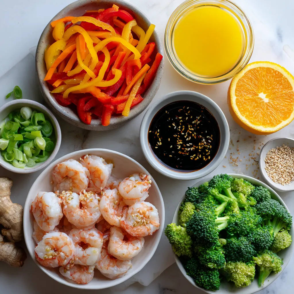 Hauptzutaten für die Orange-Sesam-Garnelen-Pfanne