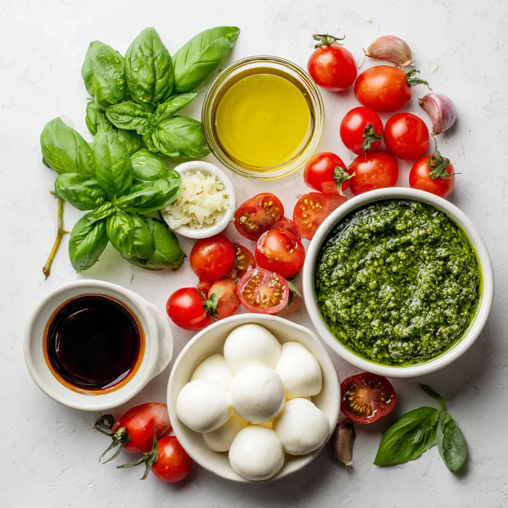 Mit diesen Zutaten hast du alles, was du brauchst, um eine köstliche Pesto Chicken Caprese Skillet zu zaubern!