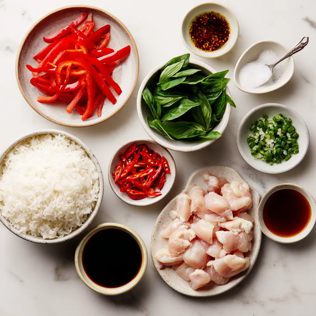 Hauptzutaten für scharfes Thai-Basilikum-Hühnchen