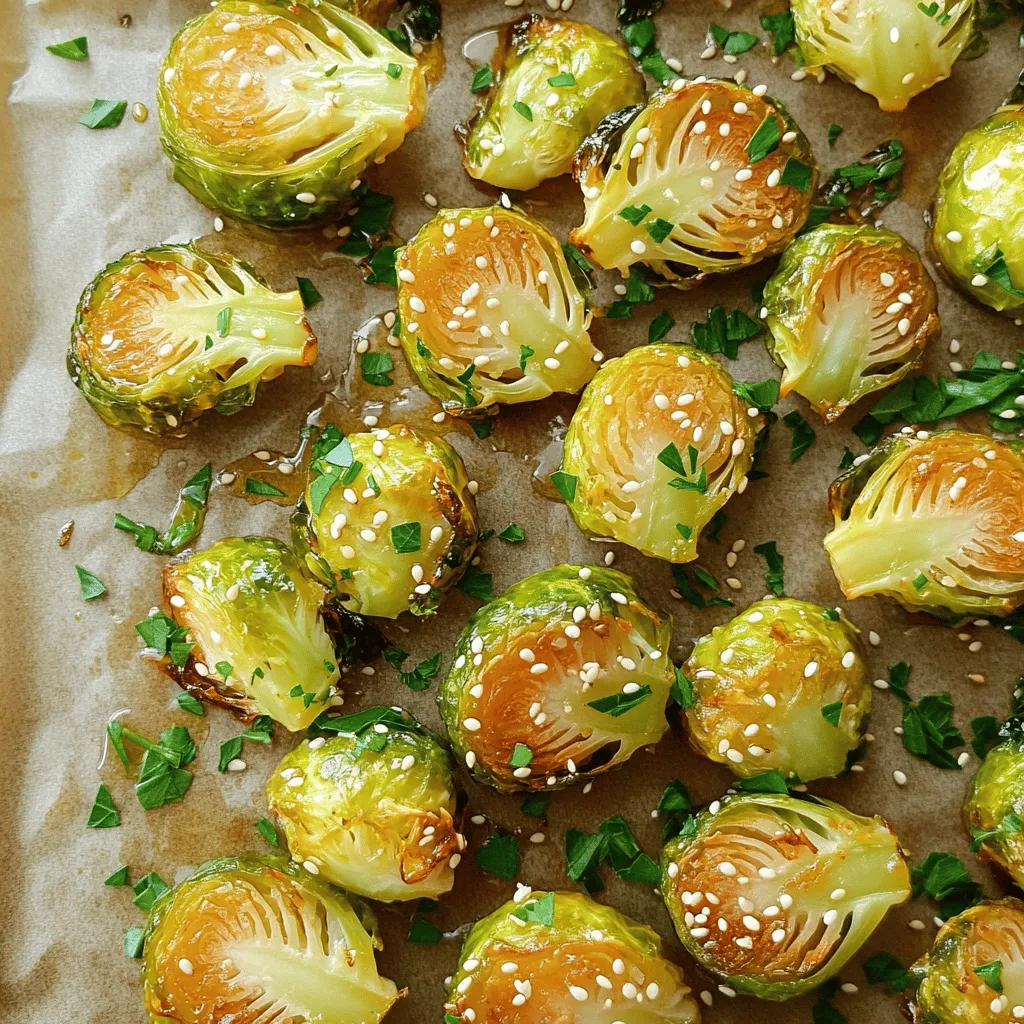 Wenn sie fertig sind, nimm das Blech aus dem Ofen. Bestreue die heißen Rosenkohlhälften mit Sesamsamen und frischer Petersilie. Jetzt sind sie bereit, serviert zu werden!