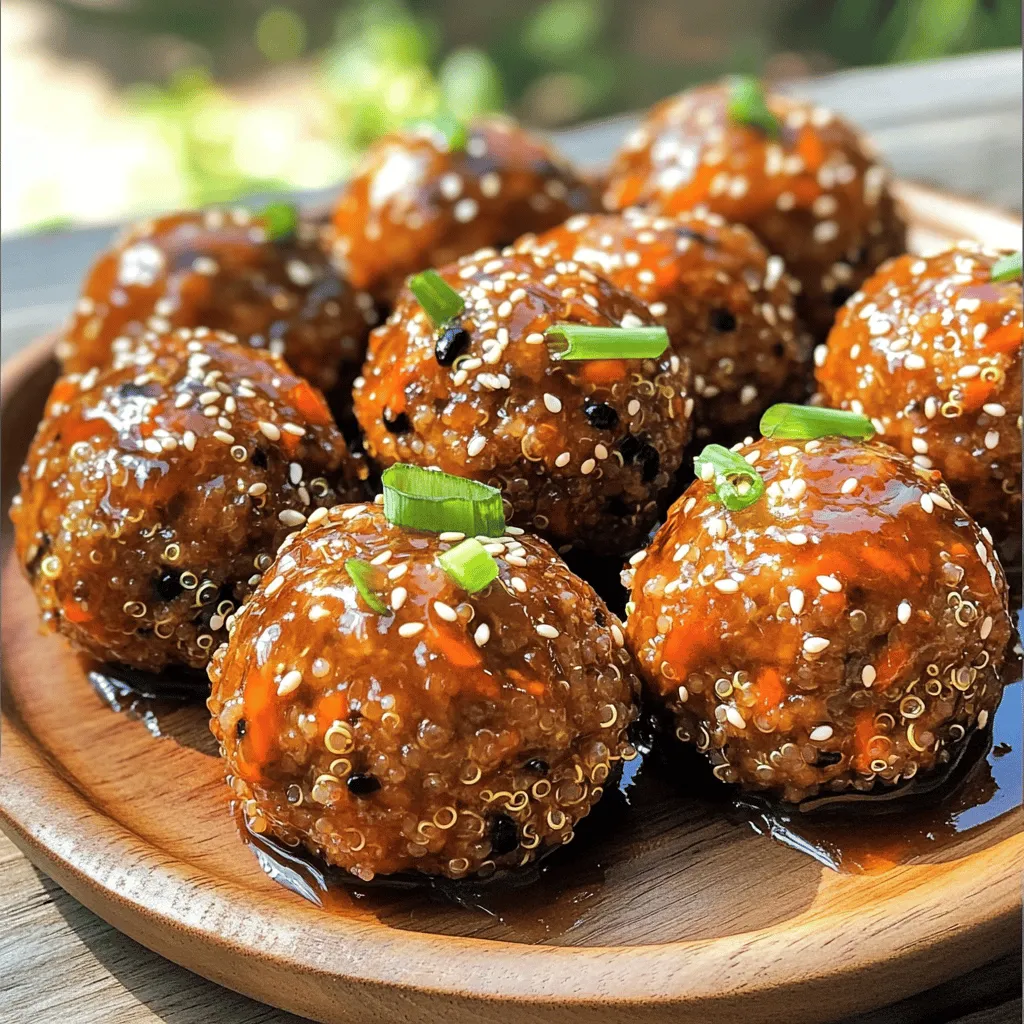 Die Hauptzutaten bilden die Basis für die Teriyaki glasierten fleischlosen Fleischbällchen. Der gekochte Quinoa bringt eine nussige Note und Protein. Die schwarzen Bohnen geben eine cremige Konsistenz. Semmelbrösel helfen, die Bällchen zusammenzuhalten. Die Karotten fügen Süße und Farbe hinzu. Knoblauch und Ingwer sorgen für einen starken Geschmack. Sojasauce und Sesamöl geben der Mischung Tiefe. Ahornsirup sorgt für süße Noten, während die Maisstärke die Glasur eindickt.