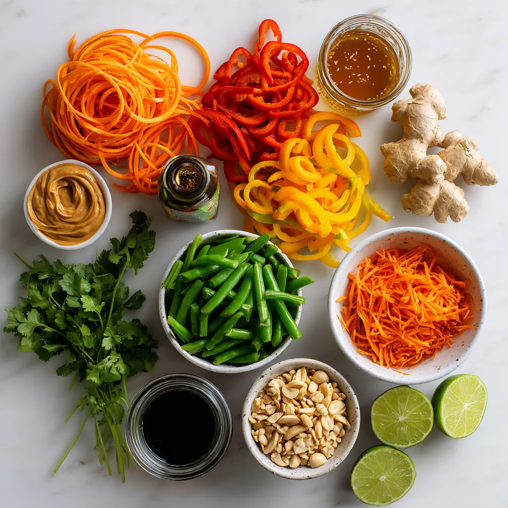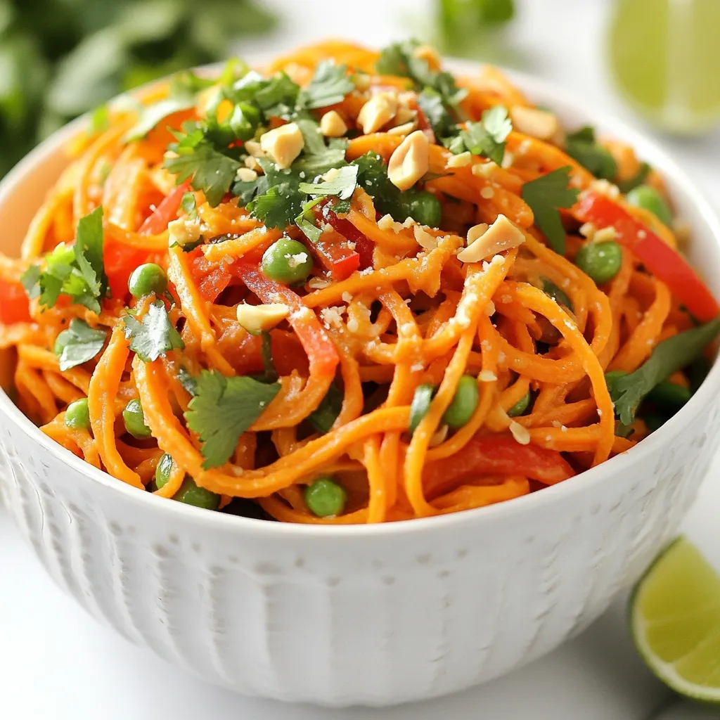 Die Süßkartoffeln sind die Basis. Sie geben den Nudeln eine schöne Süße. Ich liebe es, mit bunten Paprika zu arbeiten. Sie bringen Farbe und Knackigkeit ins Gericht. Zuckerschoten sind auch wichtig. Sie sorgen für einen frischen Biss. Karotten fügen eine zusätzliche Süße und Textur hinzu. Frühlingszwiebeln und Koriander bringen Geschmack und Frische.