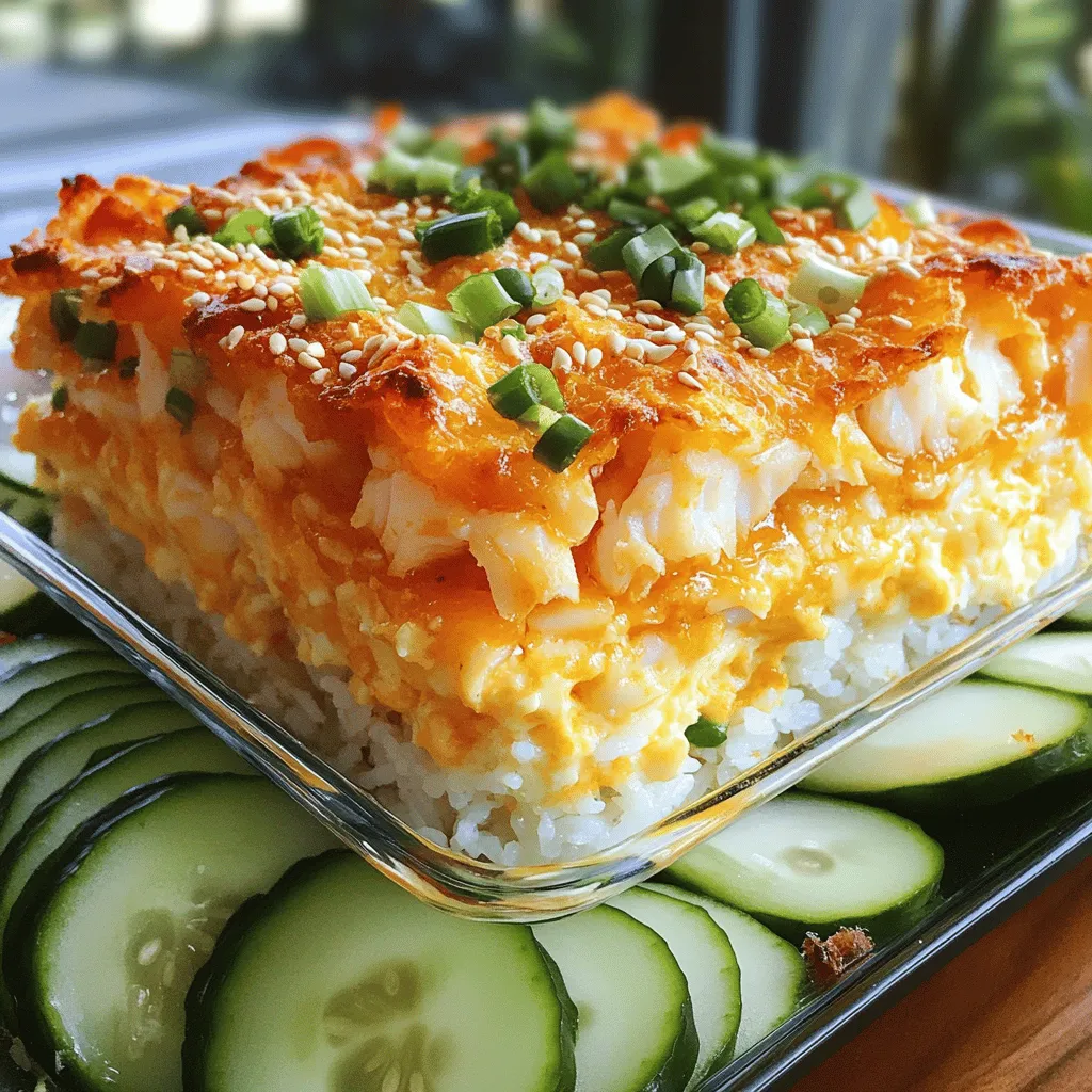 Backen Zusammenstellen: Heizen Sie den Ofen auf 175 °C (350 °F) vor. In einer gefetteten Auflaufform den gewürzten Sushi-Reis gleichmäßig auf dem Boden verteilen. Dann die Krabbenmischung über den Reis schichten und mit einem Spatel glattstreichen.