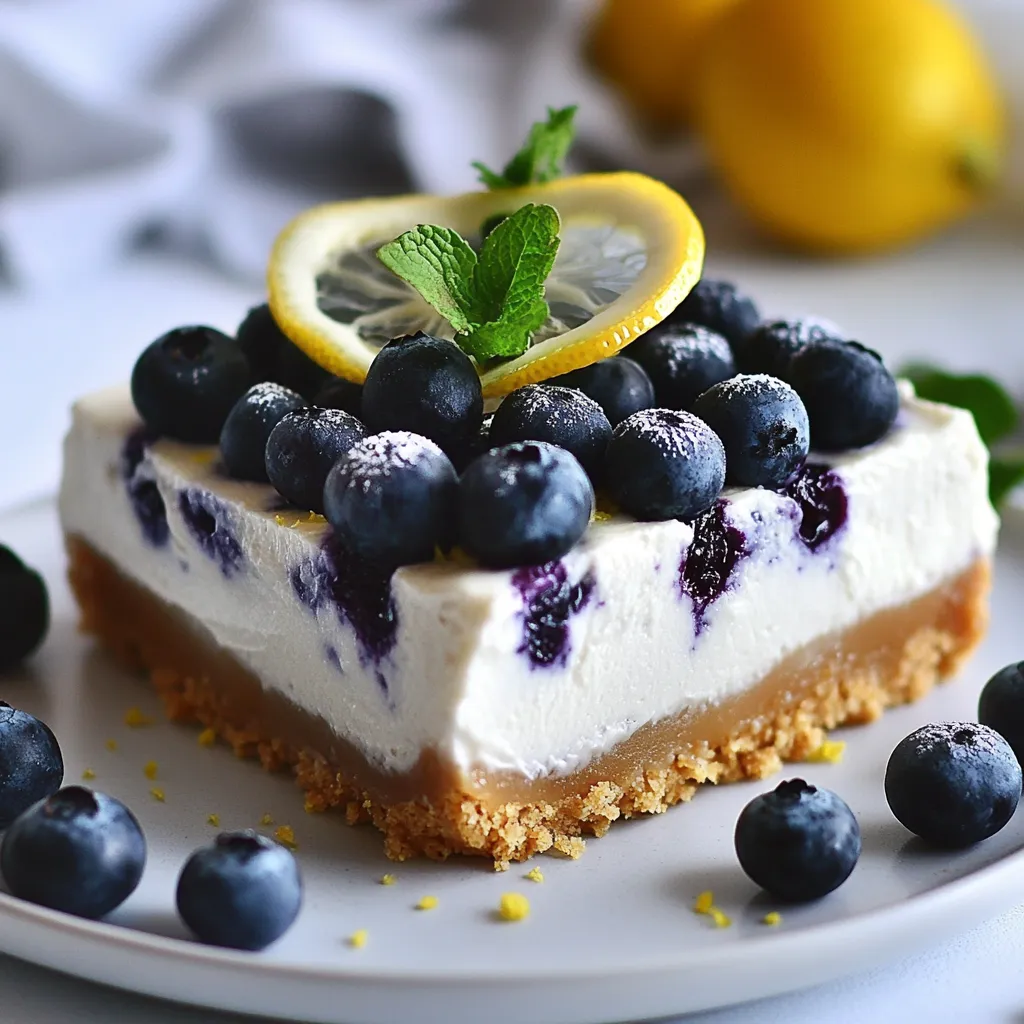 Für die Präsentation ist ein schöner Teller wichtig. Richte die Stücke darauf an. Dekoriere mit frischen Blaubeeren und Zitronenabrieb. Das sieht nicht nur schön aus, sondern bringt auch frische Aromen. Du kannst Minzeblätter hinzufügen. Diese geben einen zusätzlichen Farbtupfer und einen frischen Geschmack. Kalt servieren, damit der Käsekuchen am besten schmeckt!