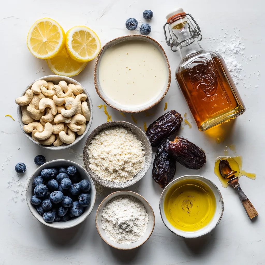 Diese Zutaten bringen den perfekten Geschmack und die richtige Textur. Die Cashewkerne machen die Füllung schön cremig. Zitronensaft und -abrieb geben den frischen, spritzigen Geschmack. Die Blaubeeren sorgen für einen fruchtigen Kick.
